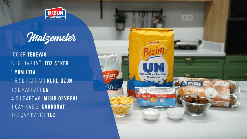 - Kuru üzüm ve mısır gevreğini ekleyin.Yoğurmadan karıştırın.