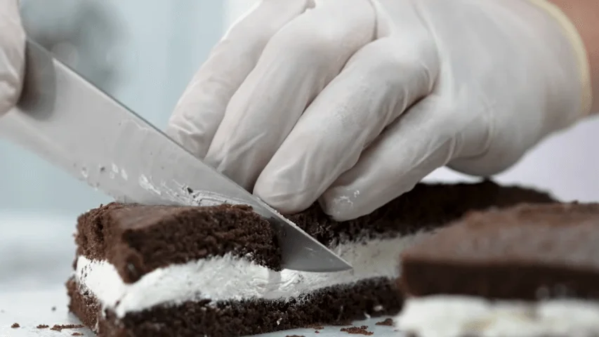 - Tepsiden ters çevirerek keki çıkarın. Kenarlarını düzeltip iki eşit parçaya bölün.