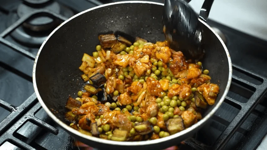 - Daha sonra bezelye ve patlıcanı ilave edin.